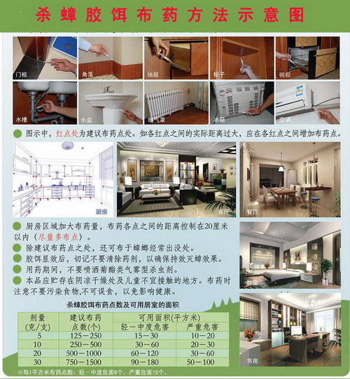 筆者從漳州明潔滅鼠除蟲公司趙經(jīng)理那了解到,現(xiàn)在最方便、也比較有效的殺蟑螂的方法就是投放毒餌。毒餌中含有生物制劑綠僵菌和昆蟲生長調(diào)節(jié)劑滅幼脲,能使蟑螂種群染菌致病,對幼蟲有很強的殺滅效果,配合粉劑及粘蟑紙使用,能有效防治蟑螂,并使蟑螂種群長期維持低密度水平。 但在投放毒餌時要注意使用得當,訣竅是“量少、點多、面廣”,即在一間房子內(nèi)多設(shè)幾個投毒點,每個點上用藥量少些,分布面廣些。這樣蟑螂從棲息場所爬出來就會吃到毒餌,殺滅效果顯著。